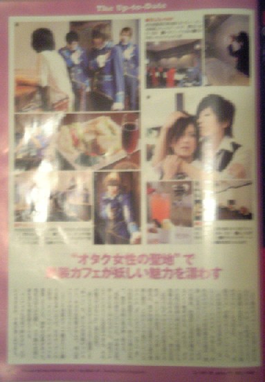 先日、旦那が暇つぶしに買った雑誌(日経トレンディ)をパラ見していたら…男装カフェの記事が!見た瞬間腐女子の香りがしたので(笑)思わず読んでしまいました。ふぇぇ~。BLカフェ!世の中にはこんなものが!乙女ロードってあるんだぁぁ。とか興味深く見ていると…旦那さんが「男のオタクって見たことあるけど、女のオタクって、そんなもんおるんかなぁ?」と…。