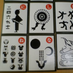 熱が下がると元気になって、でも外には出られないので暇をもてあまし、何して遊ぶー?攻撃が強烈でした。体を激しく動かすのもアレなので、おとなしくカルタなんぞしてみたり。N●Kで放送されてる子ども向け番組「にほんごであそぼ」のかるたです。絵札がねー可愛いの!完全に白地に黒のみで描かれてるんですが、なんか、いい!(デカレンのテツ風に…わかんねえよ!・笑)紙も厚手でしっかりしてて、裏地がちょっと毛羽立ったカンジの深緑の紙で味わい深し。読み札(ていう?)も昔の名文揃いなので、読んでるだけでも何か癒される…。大好き!!