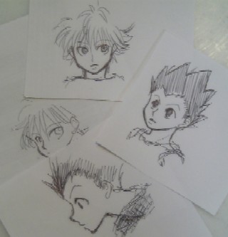 あぁキルアいいなぁ闇引きずってる顔もすごくスキだなぁたまに見ながら描いてみたほうがいいのかなぁ?いつも自分の脳内妄想と右手の勢いだけで描いているので。いや、でもアニメつけたらきっと見入っちゃって手がお留守になるよ(爆)。これはもう脳内に映像を取り込むしかないねっ。てなことで今日も天空闘技場の続き観ます(笑)。